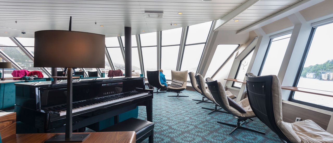Alla Hurtigrutens fartyg har en panoramasalong i fören med bekväma soffor och fåtöljer. Här kan du sitta i en skön fåtölj och följa naturen på utsidan. Sitt och bara njut av utsikten, läs en bok eller koppla av med en kopp kaffe.