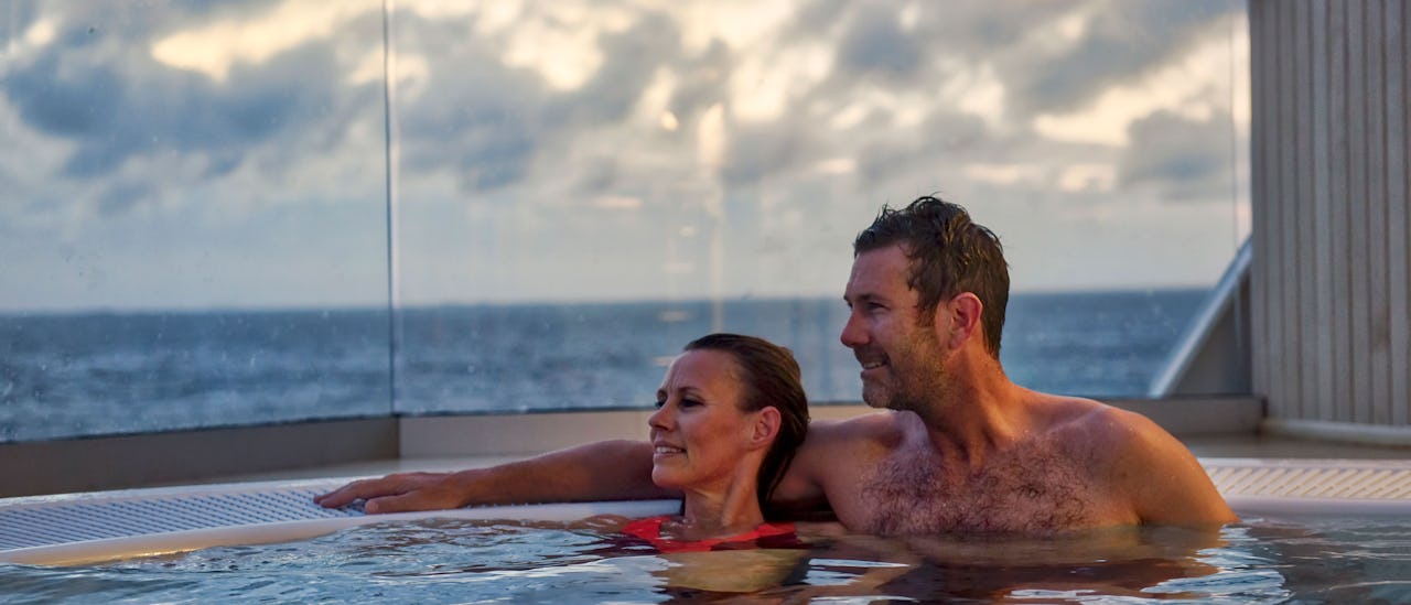 Ombord finns också jacuzzis på övre däck. Njut av det varma badet och den fantastiska utsikten. Kanske snöar det men det gör det bara till en ännu mer speciell upplevelse.