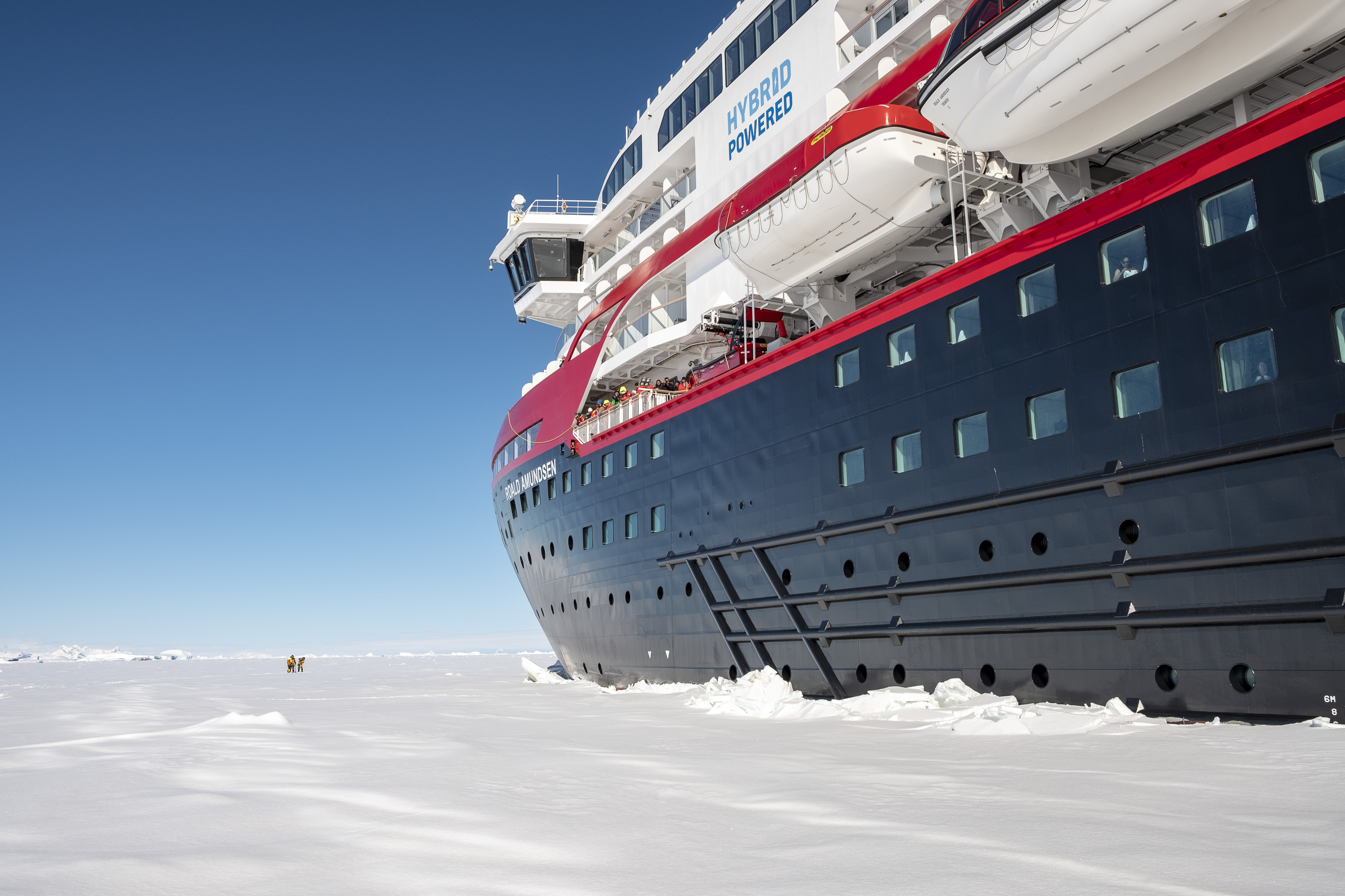 MS Roald Amundsen har anpassats för segling i arktiska farvatten då man seglar ljudlöst fram när fartyget går på el och man slipper onödiga och miljöfarliga utsläpp.