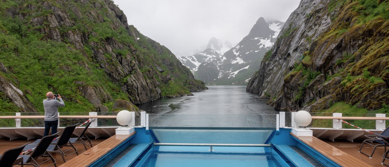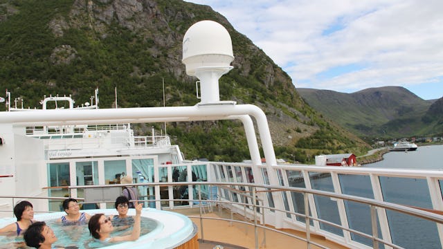 På övre däck hittar du jacuzzis. Det är mäktigt och märkligt att sitta i poolen när landskapet färdas förbi dig. Kommer det en snöflinga i luften så förgyller det bara upplevelsen. Glöm inte att packa ner badkläder!