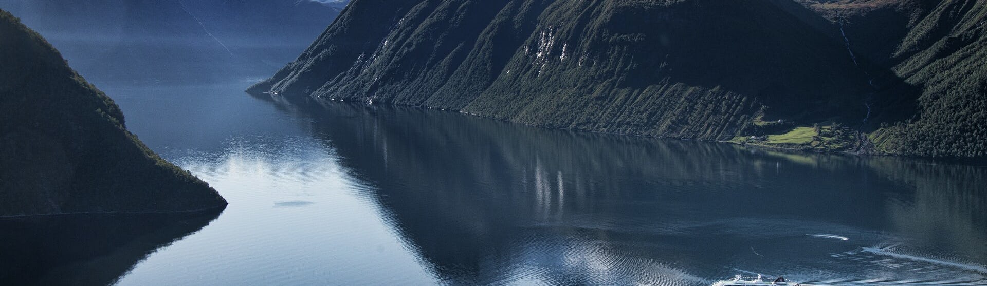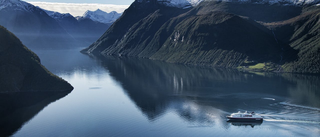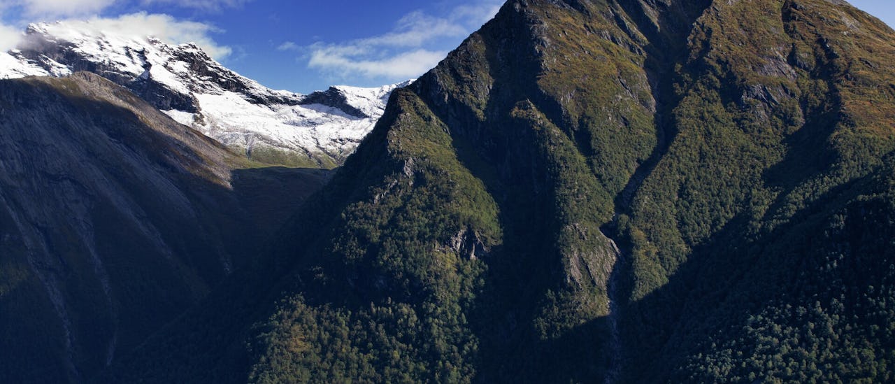 När du färdas längs fjorden behöver du bara lyfta blicken för att mötas av Sunnmørealpernas dramatiska silhuetter. Dessa berg, kallade nunataker – ett inuitiskt ord som betyder ”ensamt berg” – stack en gång upp ur den senaste istidens kilometertjocka istäcke.