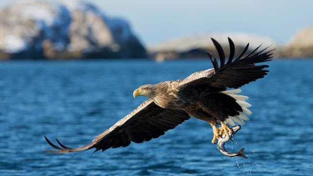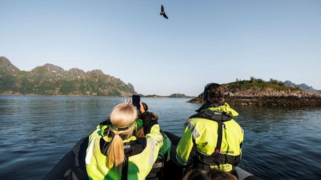 Havsörnen har en nästan 2,5 meter lång vingspann och är Nordens största rovfågel. När den sveper över dig med sina karakteristiska "fingrar" på vingarna och ljusa gula klor påminner den om historier om norrländska barn som togs av havsörnar. Trollfjorden är en majestätisk plats med spetsiga toppar och branta bergssidor som bara kan nås med båt. Här har våldsam natur givit upphov till dramatiska historier, inklusive Trollfjordsstriden där traditionella fiskebåtar kämpade mot moderna ångdrivna båtar. Nu kan du i lugn och ro utforska fjorden på en båt med gott om plats utomhus för att komma nära örnar och naturen.