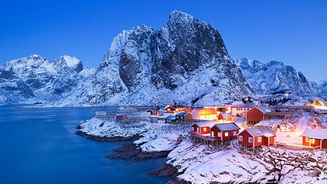 Vi börjar med stadssightseeing i Harstad, sedan besöker vi Trondenes kyrka, Trondenes historiska centrum och Medeltidsbyn. Trondenes var en viktig plats i slutet av vikingatiden, och kyrkan vi besöker är världens nordligaste medeltida stenkyrka från 1200-talet. Medeltidsbyn är ett levande museum där skådespelare och djur visar hur livet var för 800 år sedan. Efter det fortsätter vi längs Vesterålens berg och fjordar med några fotostopp, innan vi når Sortland. Där kan du se Havila Voyages fartyg passera under den nästan en en kilometer långa Sortlandbron innan du går ombord igen i Sortlands hamn.