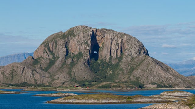Torghatten har en naturlig tunnel mitt i berget, 12–15 meter bred, dubbelt så hög och 160 meter lång. Hålet bildades när Nordamerikanska och Europeiska kontinentalplattorna kolliderade för 600 miljoner år sedan. Legender berättar att ett troll försökte skjuta en pil mot en flyende flicka, men en annan kung kastade sin hatt i vägen, vilket fick solen att förvandla trollen till sten. På vägen upp till Torghatten får du höra mer om berget och dess myter.