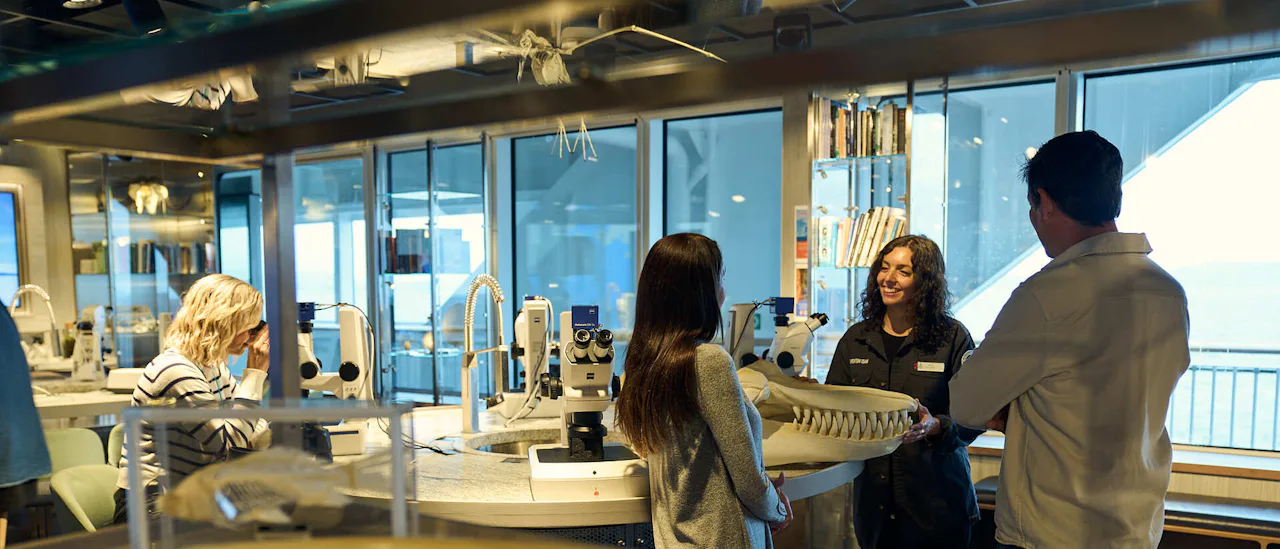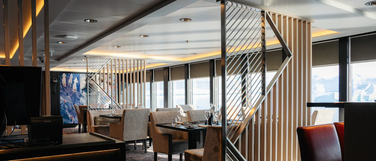 Designen ombord kännetecknas av ljus och skandinavisk stil, och färgerna i inredningen speglar nyanserna i havet. Fartyget är särskilt anpassat för segling i arktiska farvatten, där det rör sig ljudlöst på elektricitet för att minimera onödiga och miljöskadliga utsläpp.