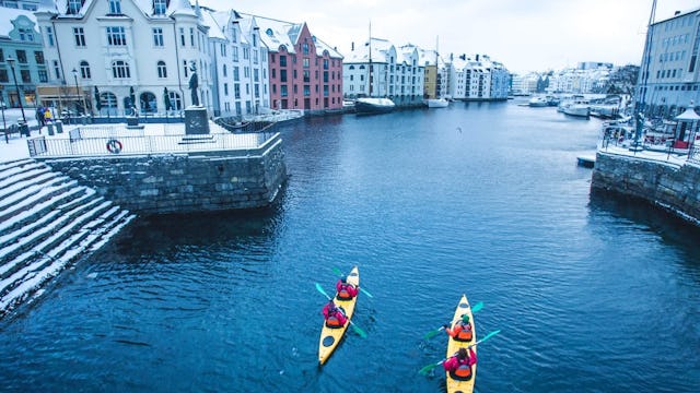 Med enkel eller dubbel kajak tar vi oss fram genom Ålesunds vatten och får ett unikt perspektiv över staden. Certifierade guider gör oss sällskap och delar med sig av stadens händelserika historia. Vi glider längs kajkanten, under broar och i hamnen förbi de vackert utsmyckade byggnader i jugendstil som uppfördes efter den förödande branden 1904. Våtdräkt, paddeljacka, handskar och skor samt flytväst ingår och vi rekommenderar att ni bär ylleunderkläder/strumpor. Havila Kystruten (AESN2) & Hurtigruten (HR-AES2K)