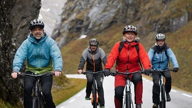 På elcyklar tar vi oss fram via en lågtrafikerad landsväg som kallas Drottningens väg. Det sägs att Norangsdalen har haft besök av sju drottningar och där av namnet, utöver kungligheterna är det många av Europas adelsmän, äventyrare och kändisar som lockats av dalens storslagna natur i över hundra år. Cykelfärden startar och slutar i Urke vid Hjørundfjorden, den är 24 km lång och den delas upp i två pass på en dryg timme. Havila Kystruten (HJFN2)