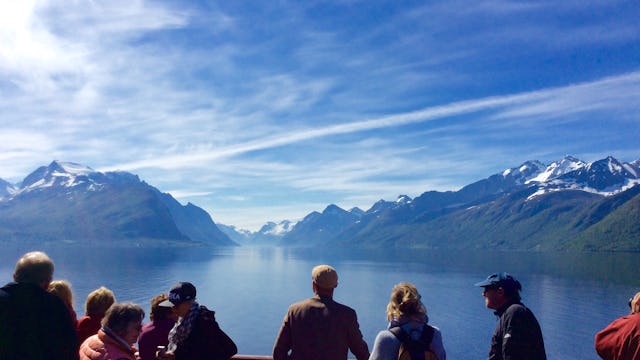 Tillsammans med en Fjordranger som berättar om livet och naturen i fjordarna reser vi på en upptäcktsfärd in mot Geiranger. Fjordkryssningen som tar tre timmar enkel väg startar i Ålesund och den tar oss med genom tre fjordar. Från öppet kustlandskap till de smala dramatiska fjordarna. Framme i Geiranger går bussen upp till Flydalsjuvet där vi kan beskåda den ikoniska bilden av Geirangerfjorden och vidare till Norweigan Fjord Center. Under vinter och tidig vår upplever vi den vilda naturen tillsammans med lugnet som vilar i fjordlandskapet. Havila Kystruten (AESN6)